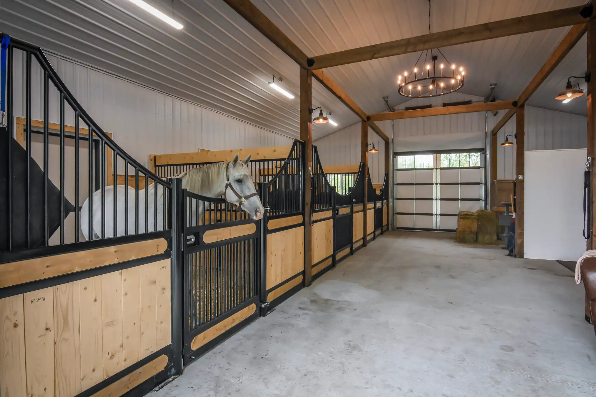 Chris and Jen’s barn is more than just a functional space – it’s a relaxing retreat where they can start their mornings with a cup of coffee while taking care of their horses. The fully finished interior enhances comfort and usability, featuring insulated wall cavities, bright metal cladding on the ceiling and walls, and a durable concrete pad. This combination creates a clean, low-maintenance environment that serves as both a working space and a peaceful escape to indulge their equestrian lifestyle.