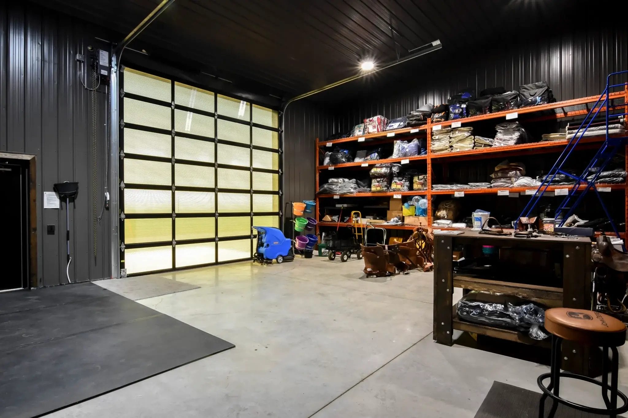 The back room of the retail building is partially lit by an overhead door with translucent polycarbonate panels. Tinted black, the polycarbonate panels stay consistent with the dark exterior aesthetic of the building, while still allowing plenty of natural light to enter.