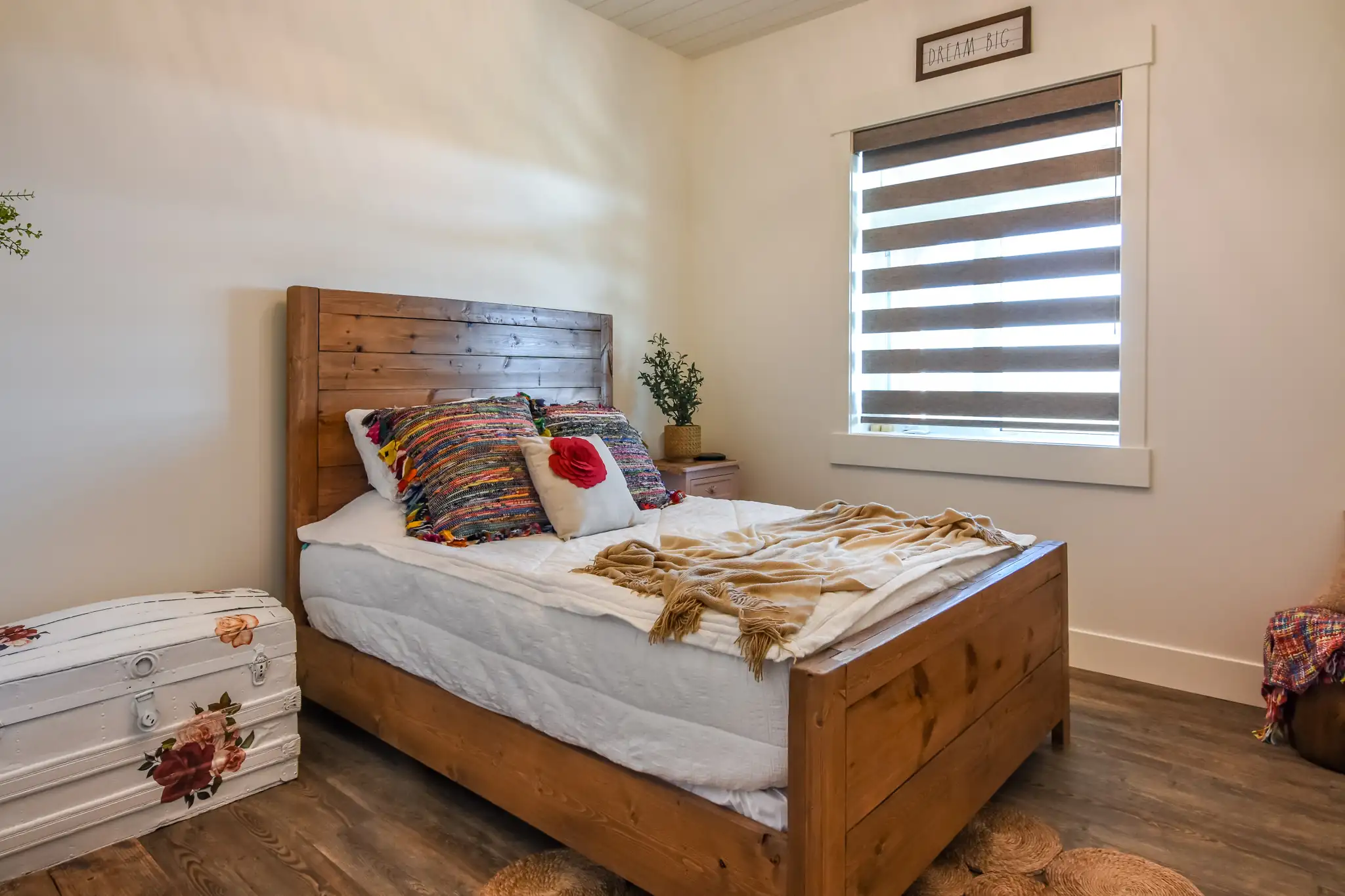 On the exterior of the home, carefully selected optional features elevate the curb appeal of the barndo, and stand out against the crisp white metal siding. Wood-tone accents, including the overhead doors, faux truss, exposed beams, plus wooden shutters carry the rustic charm across the entire exterior, creating a cohesive design.