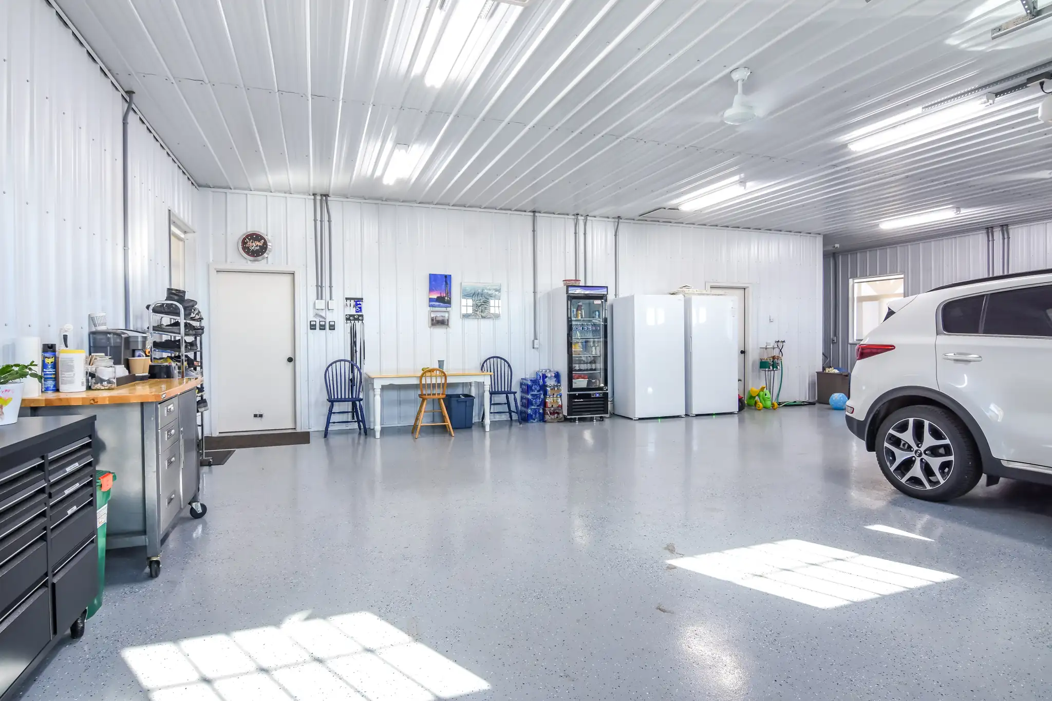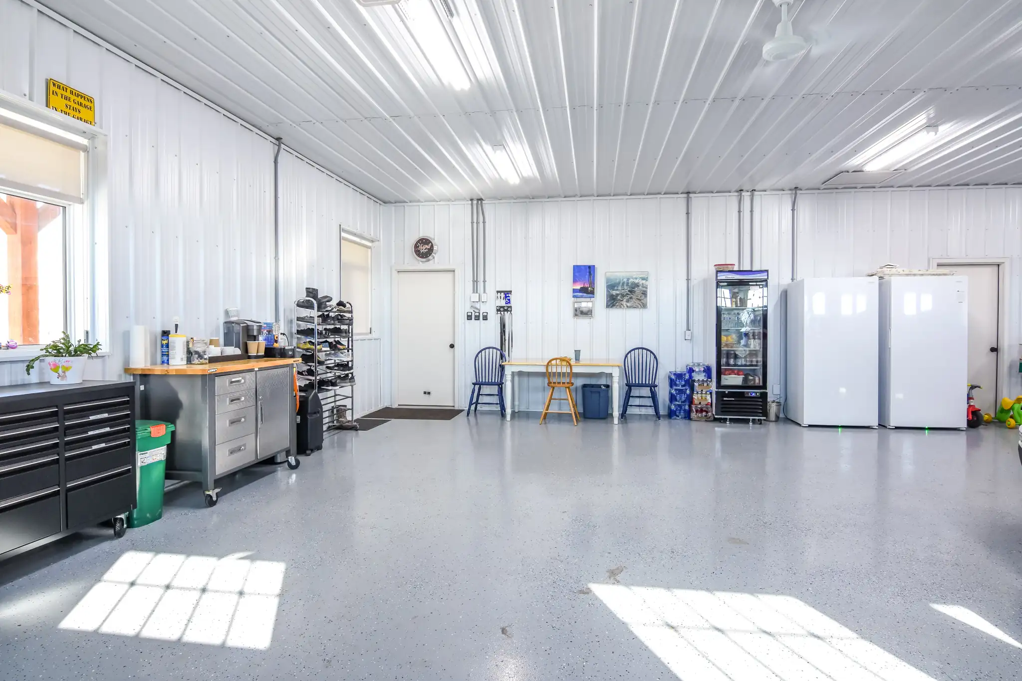 The garage’s large footprint allows it to function for more than just parking vehicles. There is ample room for tools, projects, and assorted storage, all while maintaining comfortable working space. The interior layout smartly places a washroom, storage closet, and mudroom between the garage and main living area, creating a practical transition that keeps dirt and mess out.